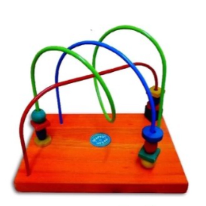 Juego para el desarrollo de la motricidad fina. Posee piezas plásticas con diversas formas geométricas y colores, enhebradas sobre coloridos rieles metálicos. Todo se encuentra montado sobre una base de madera rectangular.
